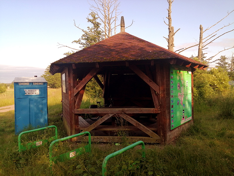 Nocleg w MOR „rzeka Bauda” na stole, nie trzeba rozkładać obozowiska. Wiata jest na tyle duża, że pomieści cały sprzęt. MOR-y w warmińsko-mazurskiem są duże, stosunkowo dobrze osłonięte od wiatru i deszczu. Mogą pomieścić wiele osób. Na całym Szlaku GV prawie wszystkie MOR-y wyposażone są w toalety typu toy-toy. Stan ich jest różny, zależny od kultury użytkowników oraz utrzymania przez gminę. Do skrajnie złych strach wejść, ale większość jest w stanie średnim, jest w miarę czysto i jest papier toaletowy. Są jednak i wysokiego standardu gdzie nawet przyjemnie pachnie. Również stan wiat jest różny podobnie jak sanitariaty. Wieczór pogodny i spokojny.