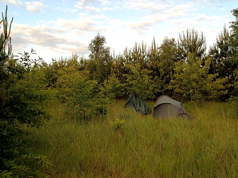 Nocleg w Wąsoszu Górnym na dziko „krzakach”. Kawałek jakiegoś nieużytku pomiędzy niewysokimi zaroślami niewidoczny z zewnątrz.
